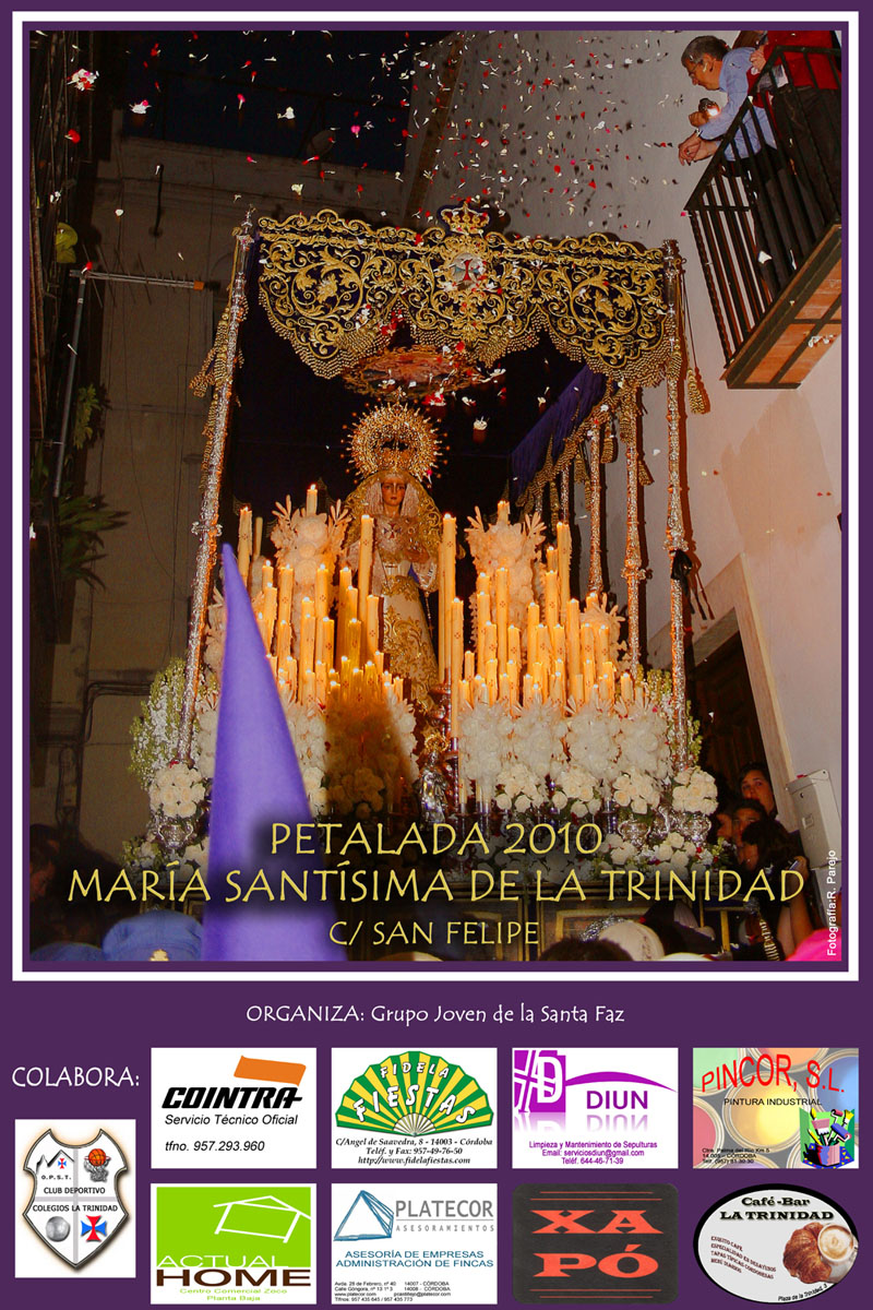 El Grupo Joven de la hermandad de la Santa Faz ha editado un cartel para recaudar fondos para una petalada que se le realizará a la Virgen de la Trinidad el Martes Santo en la calle San Felipe. La foto que ilustra el cartel es obra de Rafael Parejo y representa el momento en el que la Virgen de la Trinidad desciende la Cuesta de Luján: