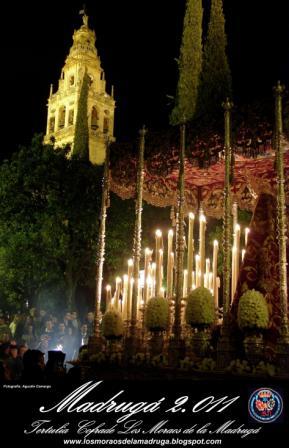 Tras presentaros el cartel oficial de la Semana Santa de Córdoba ahora toca el turno del cartel de la tertulia cofrade «Los Moraos de la Madrugá» 2011. En este cartel podemos apreciar una magnífica fotografía de Agustín Camargo en la que se ve a la Reina de los Mártires en el Patio de los Naranjos con la torre de la Catedral de fondo en la madrugada del 2010: