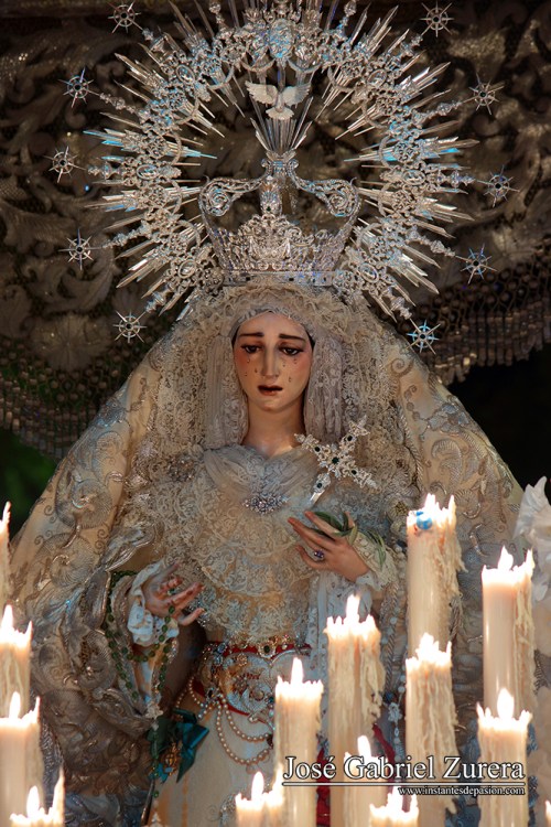 En este año he tenido el privilegio de ser premiado con un accésit por la fotografía «Regina Pacis». Una fotografía de la Virgen de la Paz y Esperanza momentos antes de entrar en los Jardines de la Merced de la Plaza de Colón, cuando la noche del Miércoles Santo ya había dado paso a la madrugada del Jueves Santo.