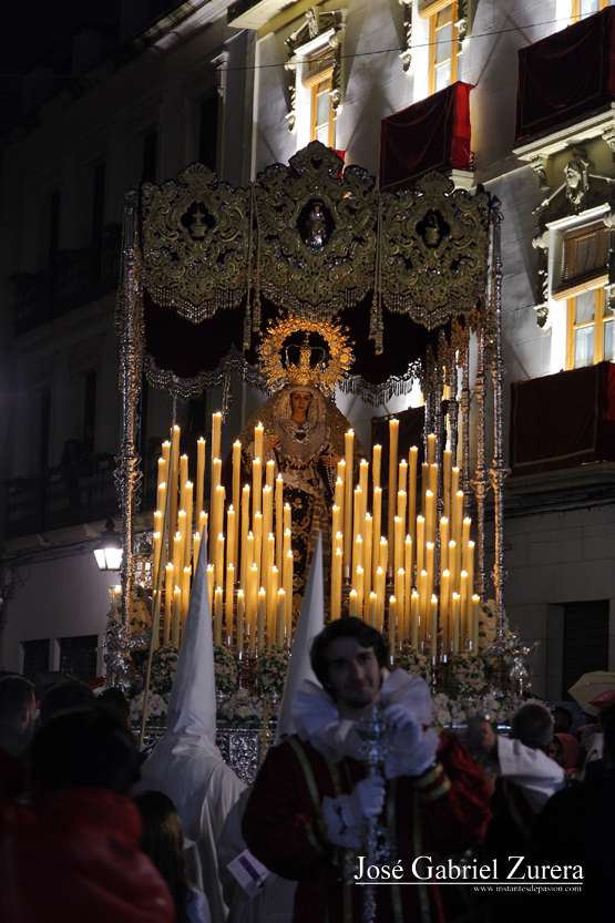 Pero el tiempo volvió a ser cruel con las cofradías, apenas estaba el palio de la Virgen de la Candelaria culminando la calle San Fernando cuando la lluvia volvió a hacer acto de presencia, obligando a los tres pasos de la cofradía a subir de forma precipitada la carrera oficial para refugiarse en el Instituto Góngora. Tras unos minutos de espera, un claro permitió a la hermandad volver sobre sus pasos camino de San Francisco, acompañados por su cortejo procesional y con el único acompañamiento musical del tambor. Y una vez más la lluvia vino a estropear el regreso, apareciendo con gran intensidad cuando la cofradía entraba en el Compás de San Francisco y descargando con fuerza sobre el palio.